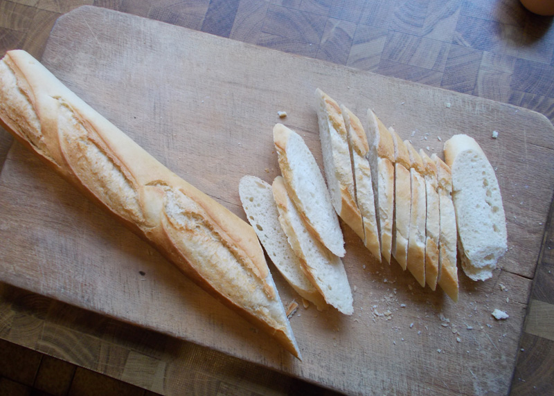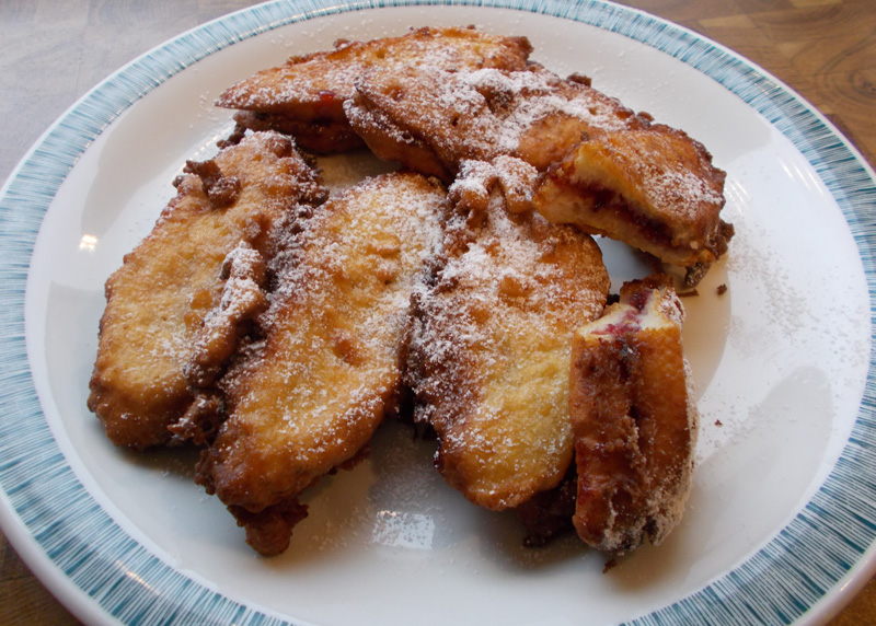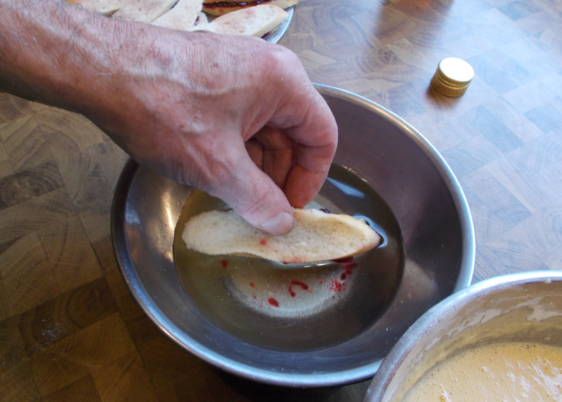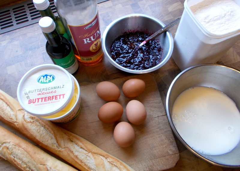 Zutaten: Weißbrot (zB Baguette), Powidlmarmelade, Rum, Weißwein, Eier, Mehl, Zucker und Butterschmalz