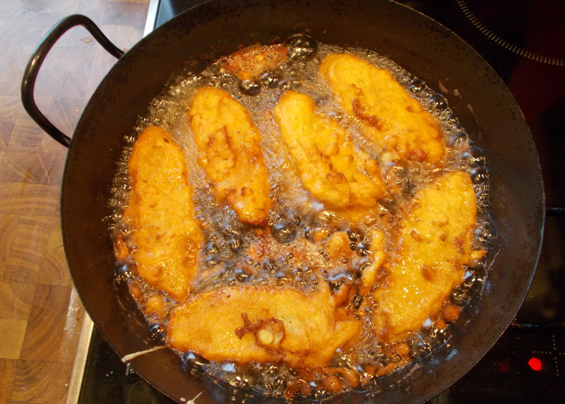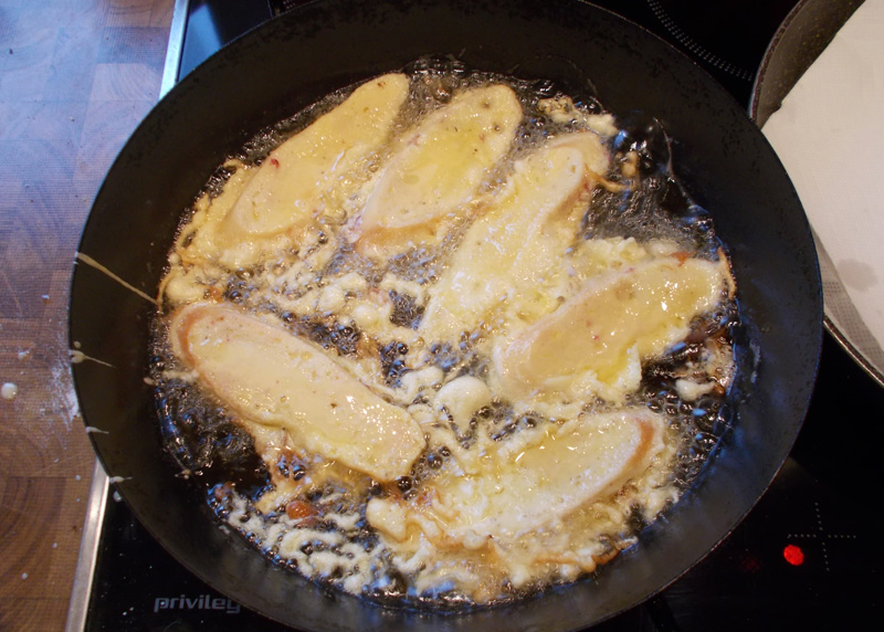 Die Weißbrot-Powidl-Brötchen mit Rum beträufeln, in den Weißwein tunken und dann in den Backteig geben und sofort ins heiße Butterschmalz legen, wo sie schwimmend herausgebacken werden. Beidseitig – also einmal wenden.