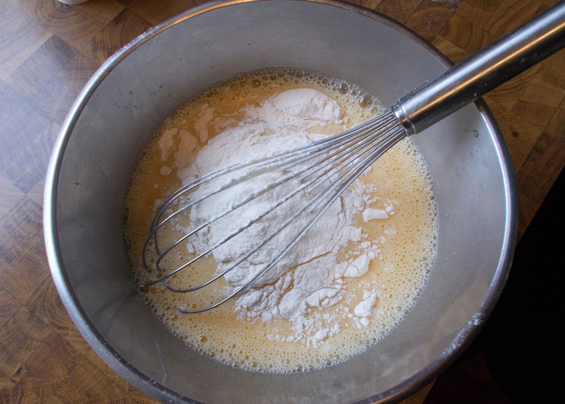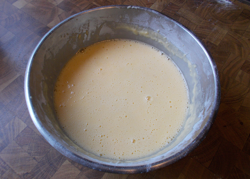 Eier mit etwas Milch, Staubzucker und Mehl gut glattrühren – Konsistenz soll die eines leichten Palatschinkenteiges sein.