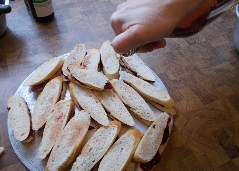 Das Brot in dünne Scheiben schneiden. Je eine Scheibe gut mit Powidlmarmelade bestreichen und eine weitere Scheibe als Deckel draufsetzen.