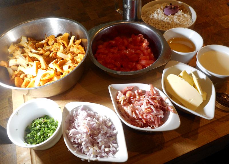 Zutaten Eierschwammerl: 500 g Eierschwammerl, 3 Tomaten, 100 g Speck, 1 Zwiebel, 1 Knoblauchzehe, 1 EL Butter, 2 EL Öl, 1/6 l Obers, Kümmel, Petersilie, ein Spritzer Weißwein, Salz, Pfeffer | Zutaten Reis: 100 g Reis, die doppelte Menge Wasser/oder Suppe (1 Teil Reis/2 Teile Wasser), 80 g Butter, 1 kleine Zwiebel , 4 Nelken , ½ Suppenwürfel