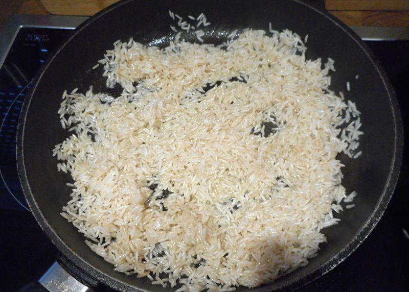 Den Reis waschen und in einem Sieb gut abtropfen lassen. In einer tiefen Pfanne/Kasserolle den Reis in Butter …