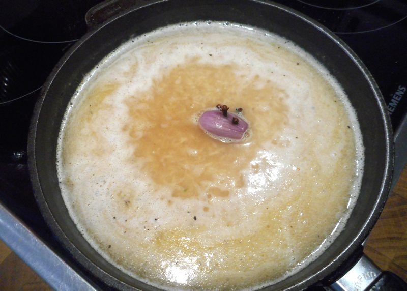 Zutaten Reis: 100 g Reis, die doppelte Menge Wasser/oder Suppe (1 Teil Reis/2 Teile Wasser), 80 g Butter, 1 kleine Zwiebel , 4 Nelken , ½ Suppenwürfel
