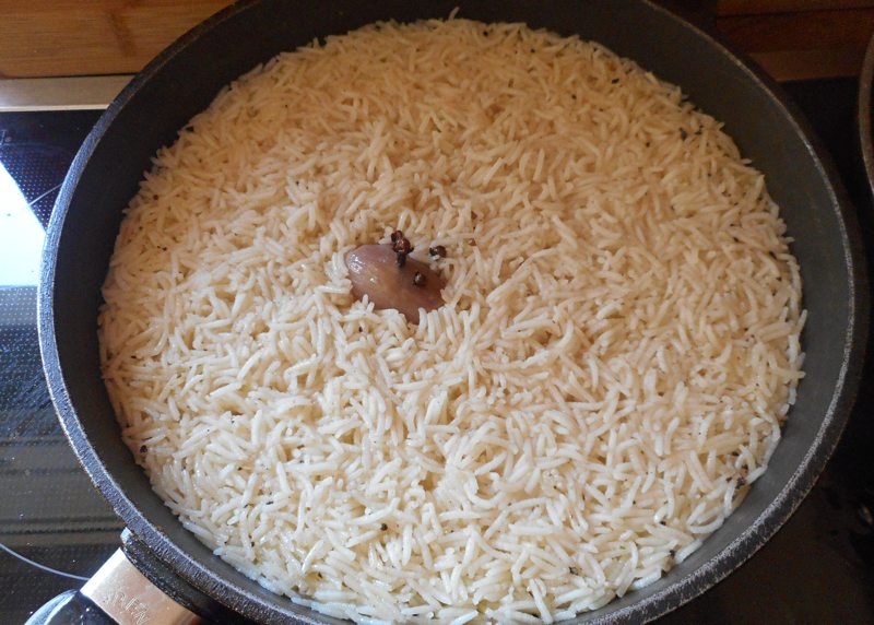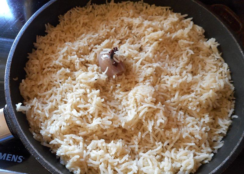 Tipp: Ich gebe gerne eine kleine, mit Nelken gespickte Zwiebel zum Reis, das gibt einen guten Geschmack.