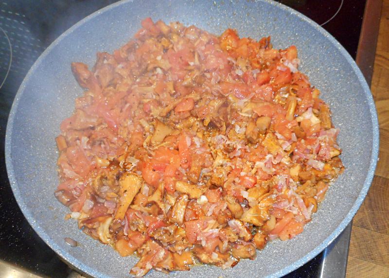 Eierschwammerl mit Tomaten, Speck und gedünsteten Reis