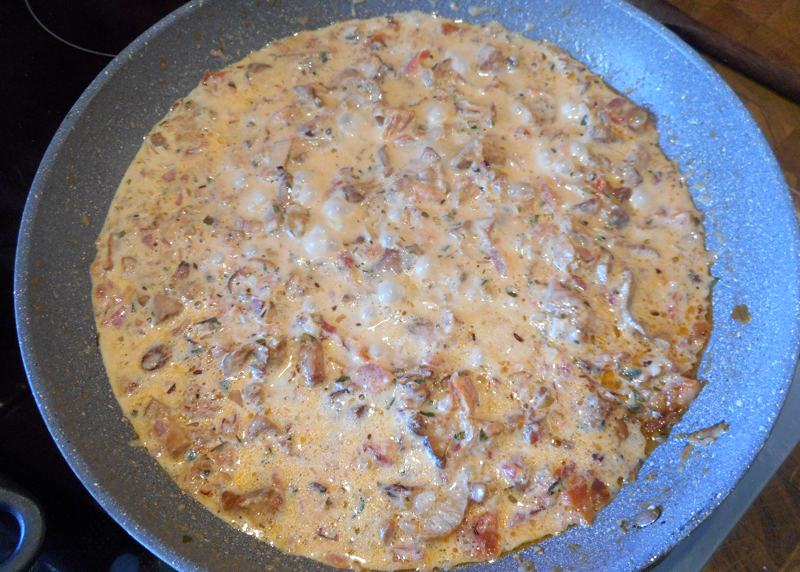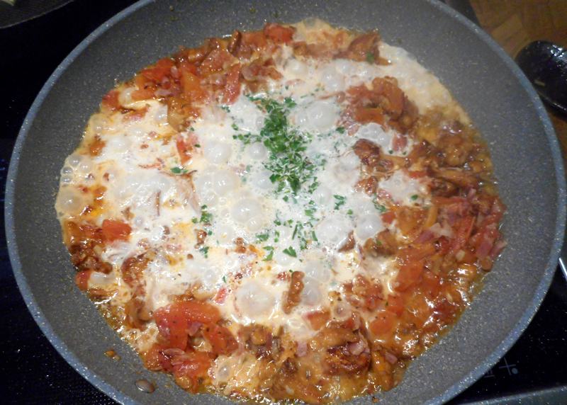 … mit Wein und Obers ablöschen, aufkochen lassen, würzen …