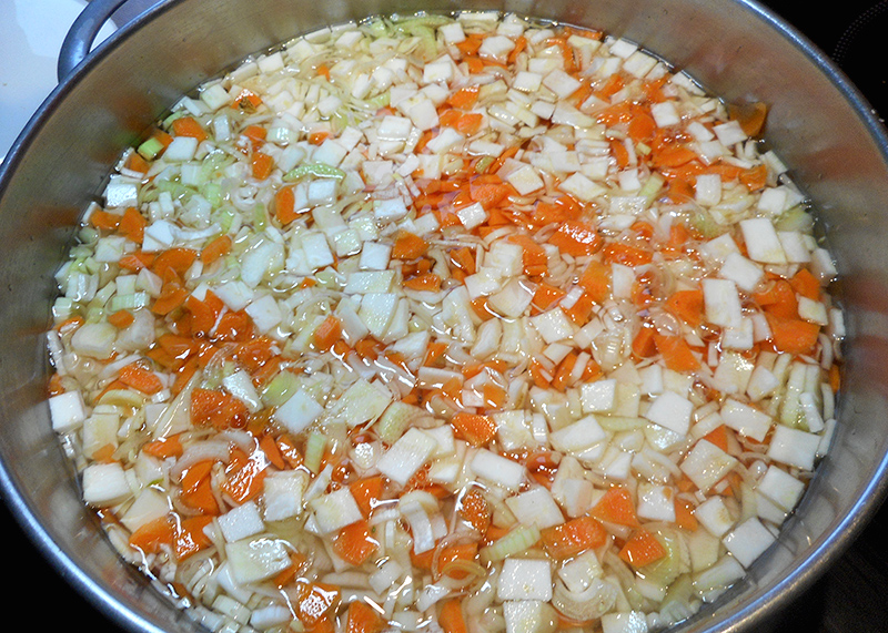 Das Wurzelgemüse kleinwürfelig schneiden und blanchieren. Zwiebel und Knoblauch hacken und leicht anrösten.