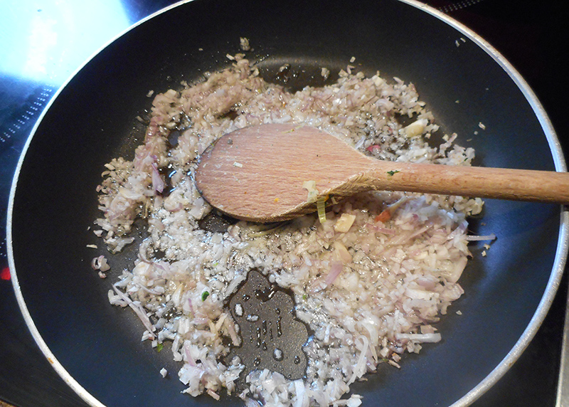 Zwiebel und Knoblauch hacken und leicht anrösten.