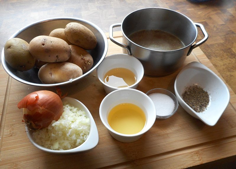 Zutaten: 500 bis 700 g festkochende Kartoffeln, 1 kleine Zwiebel, 4 bis 5 EL Öl, 4 EL Essig, 1/6 l Suppe, Salz und Pfeffer