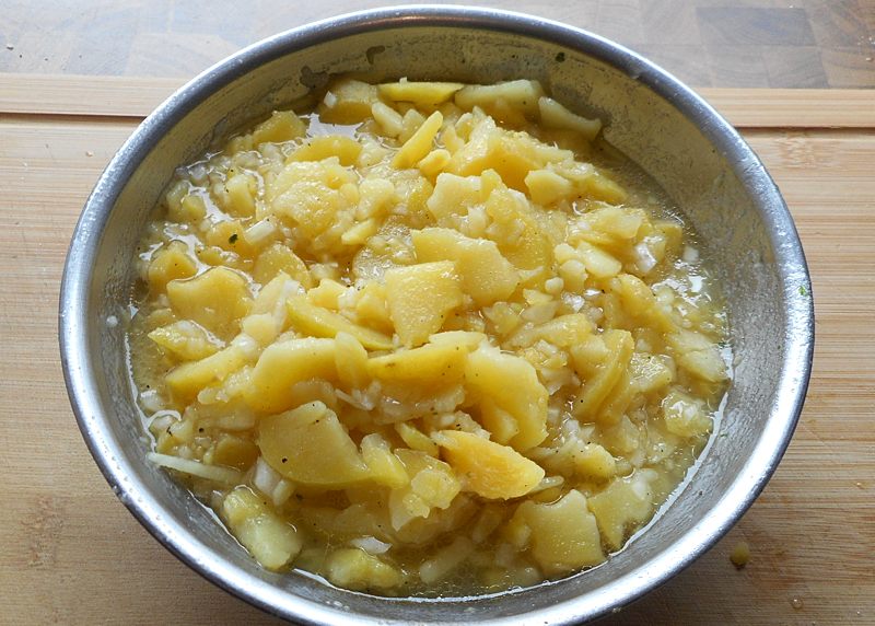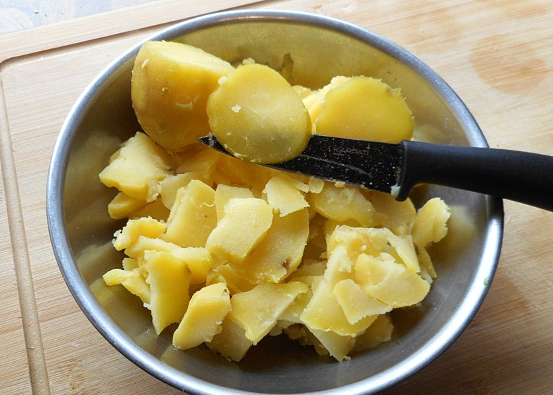 Die Kartoffeln mit der Schale kochen, schälen und in Scheiben schneiden.
