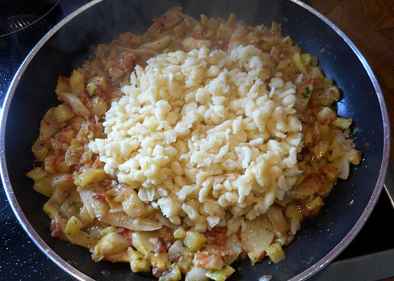 Jetzt das Gemüse entweder direkt auf dem Teller über die warmen Nockerl geben, oder die Nockerln kommen auch in die Pfanne …