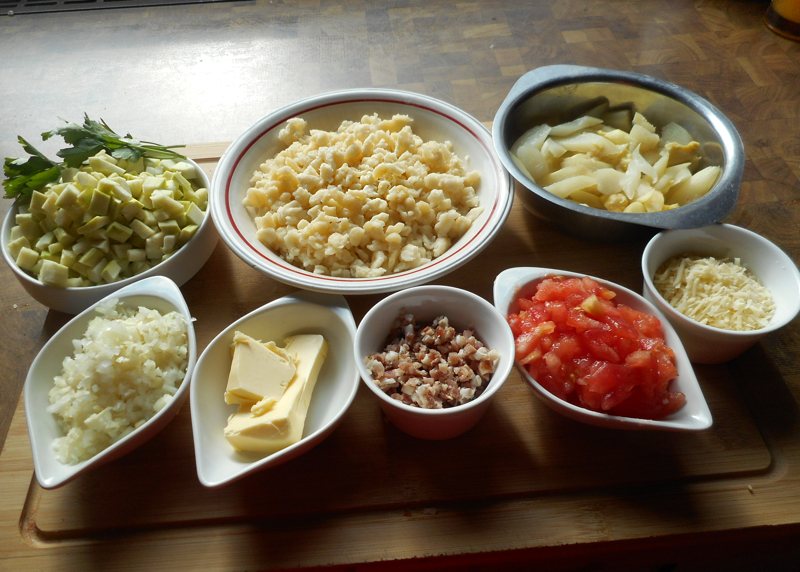Zutaten: Nockerl, 2 Zucchini, 500 g Spargel, 1 – 2 Tomaten, 1 Zwiebel, 1 Knoblauchzehe, 100 g Speck (wer mag), 50 g Butter, Salz, Pfeffer, Muskat, Petersilie, geriebener Käse | Zutaten und Zubereitung Nockerl siehe hier: Nockerlrezept