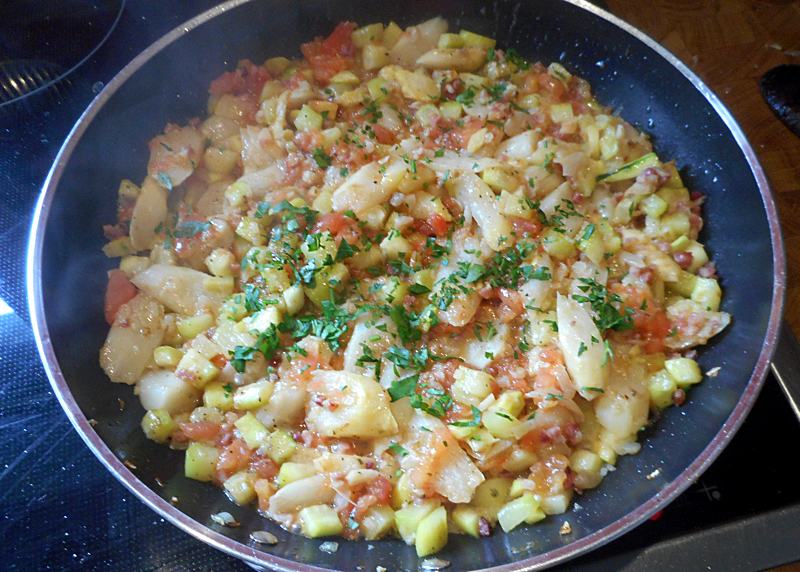 Zwiebel und Speck in Butter (oder Öl) anschwitzen, Zucchini und Spargel dazugeben und rösten. Dann die Tomaten und die Petersilie untermischen und würzen.
