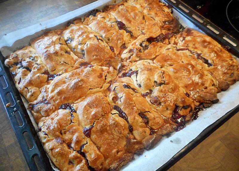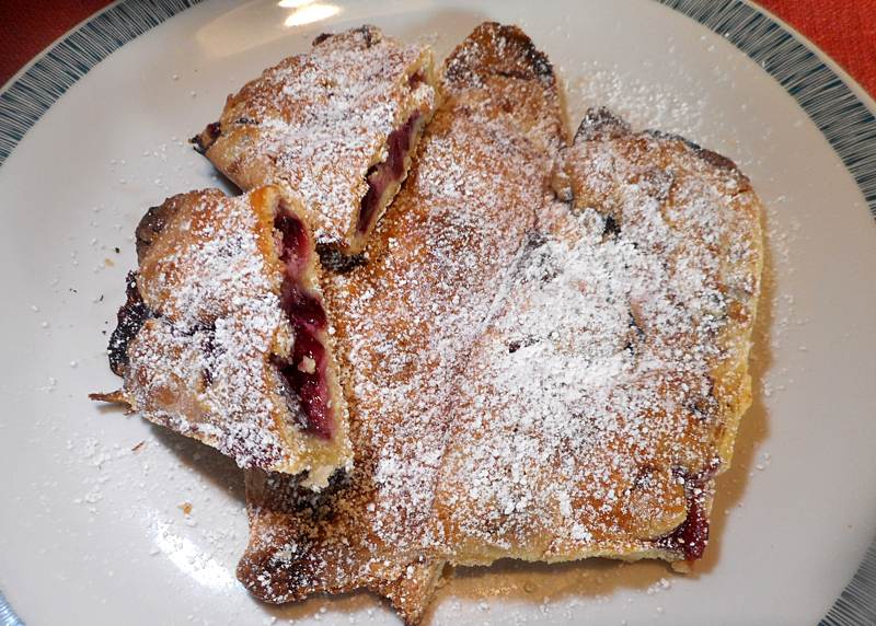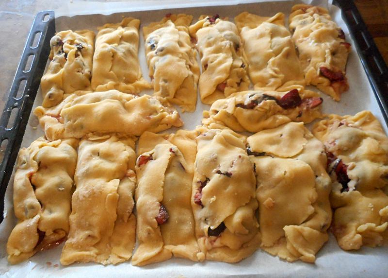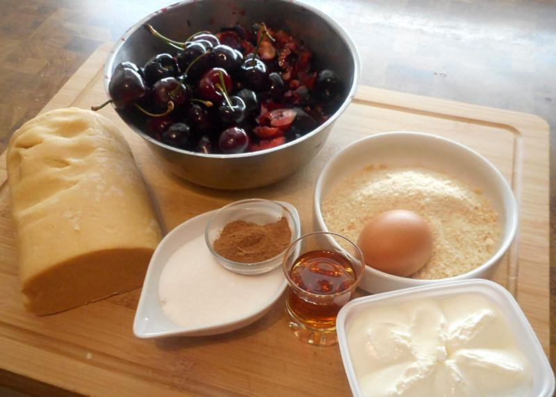Zutaten Fülle: ½ kg Kirschen, TL Zimt, 2 bis 3 EL Zucker, Spritzer Rum, Zitronensaft, 2 bis 3 EL Semmelbrösel, 100g Topfen, 1 Ei | Zutaten Teig: 250 g Butter, 50 g Zucker, 500 g Mehl, 3 bis 4 Dotter, etwas Obers, ca. 1/16 l Weißwein oder Most, Spritzer Essig, Salz – ein Ei zum Bestreichen