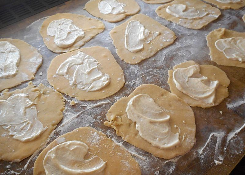 Zutaten Teig: 250 g Butter, 50 g Zucker, 500 g Mehl, 3 bis 4 Dotter, etwas Obers, ca. 1/16 l Weißwein oder Most, Spritzer Essig, Salz – ein Ei zum Bestreichen