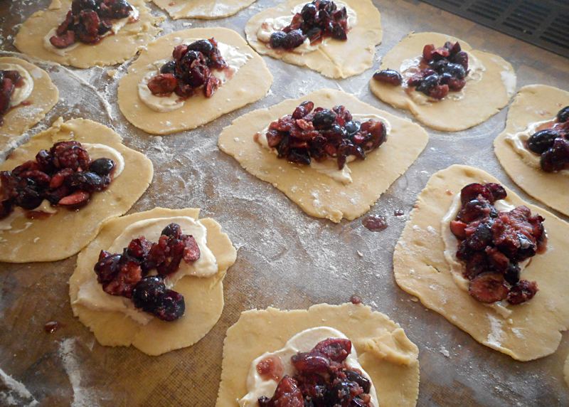 Die Teigstücke mit der Topfen-Masse bestreichen, mit Kirsch-Mischung belegen, zusammenschlagen und auf ein Backblech legen. Dann mit Ei bestreichen und im auf 180 Grad vorgeheizten Backrohr 25 bis 30 Minuten backen.
