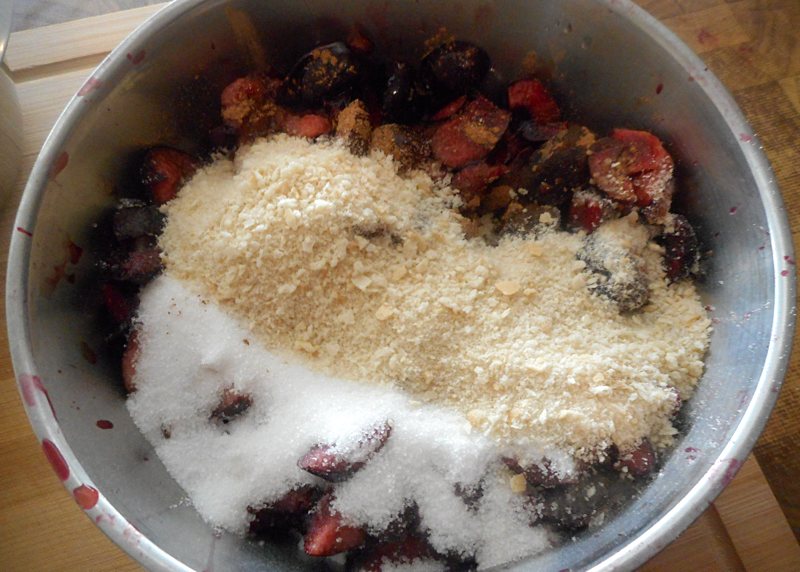 Die Kirschen entkernen, und mit Brösel, Zucker, Rum, Zitronensaft und Zimt vermischen.
