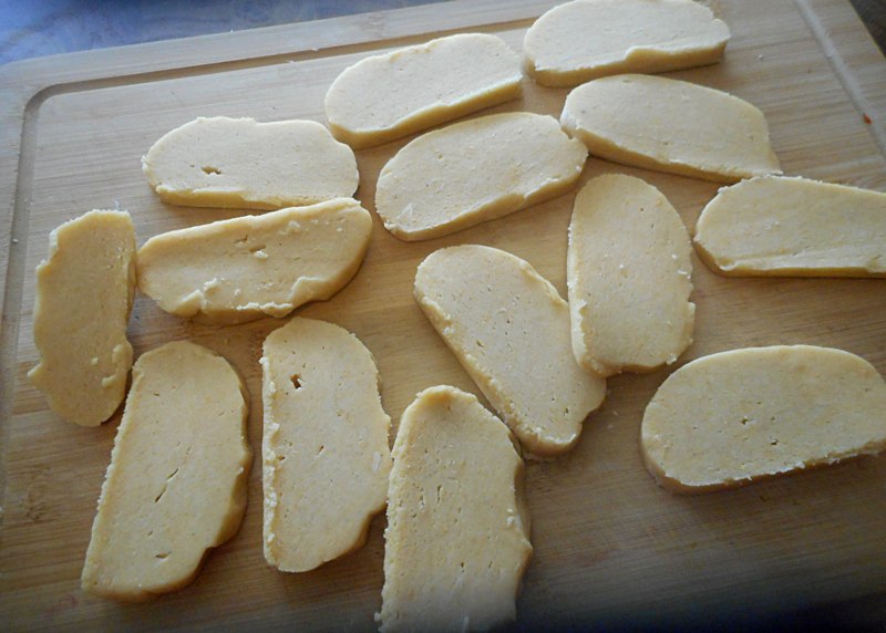 Den Teig aus dem Kühlschrank nehmen und in Scheiben schneiden.