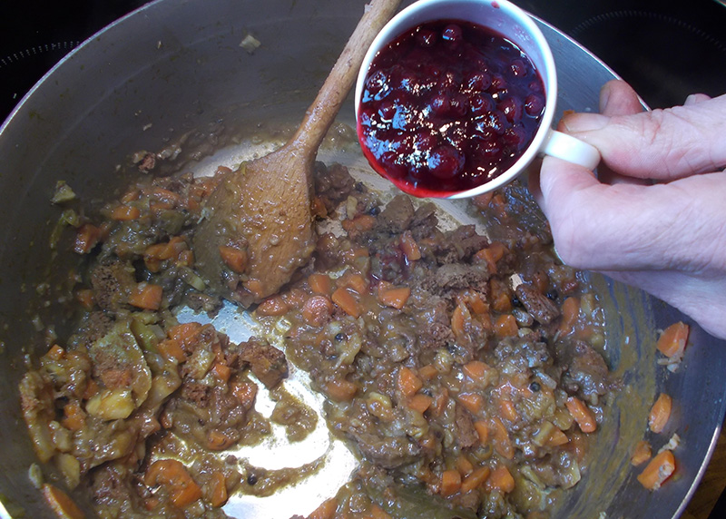 Die Flüssigkeit im Topf sollte durch die Lebkuchen eine leichte Bindung bekommen. Eventuell etwas Flüssigkeit nachgießen (Bouillon, noch etwas Rotwein). Ca. 10 Minuten köcheln lassen.