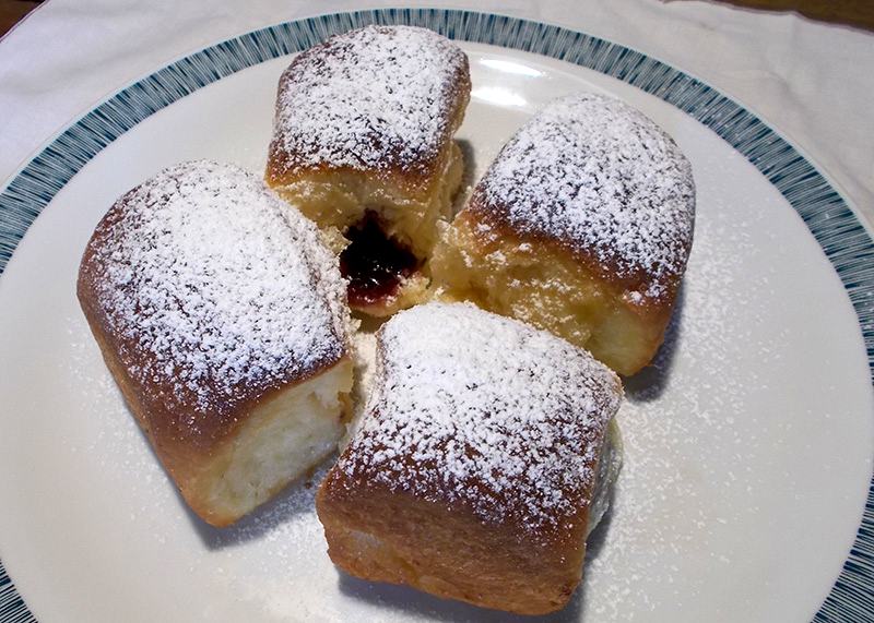 Zutaten: 80 dag Mehl, 4 Dotter, 2 ganze Eier, 20 dag Butter, 3/8 l Milch, Hefewürfel, zwei gehäuft EL Zucker, 1 Pkg. Vanillezucker, Zitronenabrieb, 4 cl Rum, Prise Salz, Marmelade