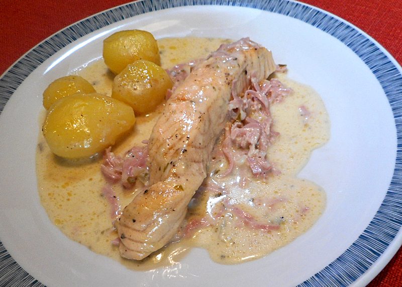 Zutaten für Lachs und Spinat: Lachsfilets, Blattspinat, Obers, Zwiebel, Knoblauch, Butterschmalz, Olivenöl, Butter, Weißwein, Zitrone, Muskat, Salz, Pfeffer
