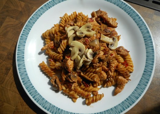 Zutaten: Nudeln, Putenfleisch, Champignons, getrocknete Tomaten, Zwiebel, Öl, Salz, Pfeffer