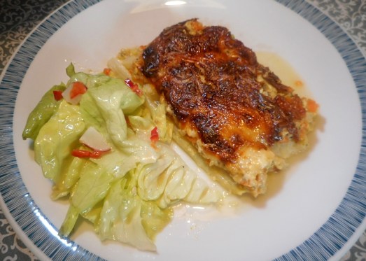 Zutaten: Seefisch, Zucchini, Hörnchen, Speck, Zwiebel, Knoblauch, Dill, Petersilie, Butter, Öl, Salz, Pfeffer