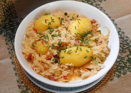 Zutaten: Frischkraut (das erste Kraut des Jahres), Kartoffeln, Zwiebeln, getrocknete Tomaten, Speck, 1 Esslöffel Butterschmalz oder Öl, 1/8 l Obers, 2 Esslöffel Essig, 1/16 l Wein, Salz, Lorbeer, Kümmel, Pfefferkörner, 1 Esslöffel Zucker, Suppe oder Wasser zum Aufgießen