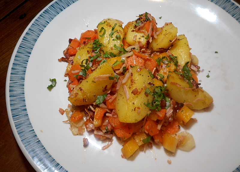 Im „Gröstl“ steckt schon im Wort selbst, worum es hauptsächlich geht. Gut, man muss die Zutaten in Form bringen … aber dann: Ab in die Pfanne damit! Je nach Gusto mit oder ohne Schinken.