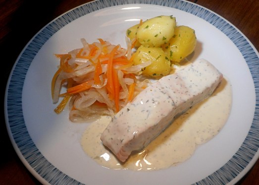 Zutaten: Kabeljau, Öl, etwas Mehl, Butter, Weißwein, Zitronensaft. Für die Haube: Speck, Champignons, getrocknete Tomaten. Für die Dillkartoffeln: festkochende Kartoffeln, Dill, Obers, Zwiebel, Butter, Salz, Pfeffer